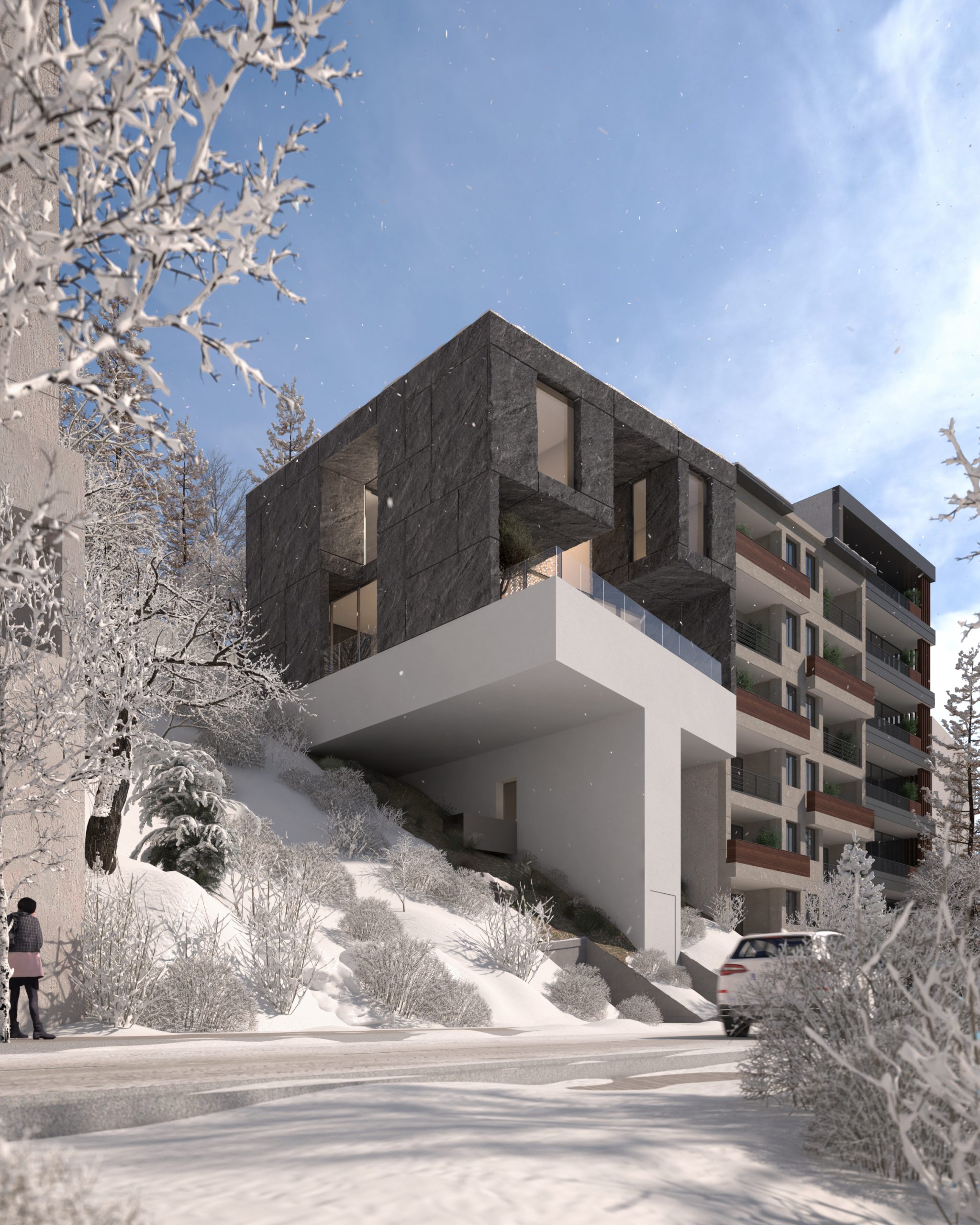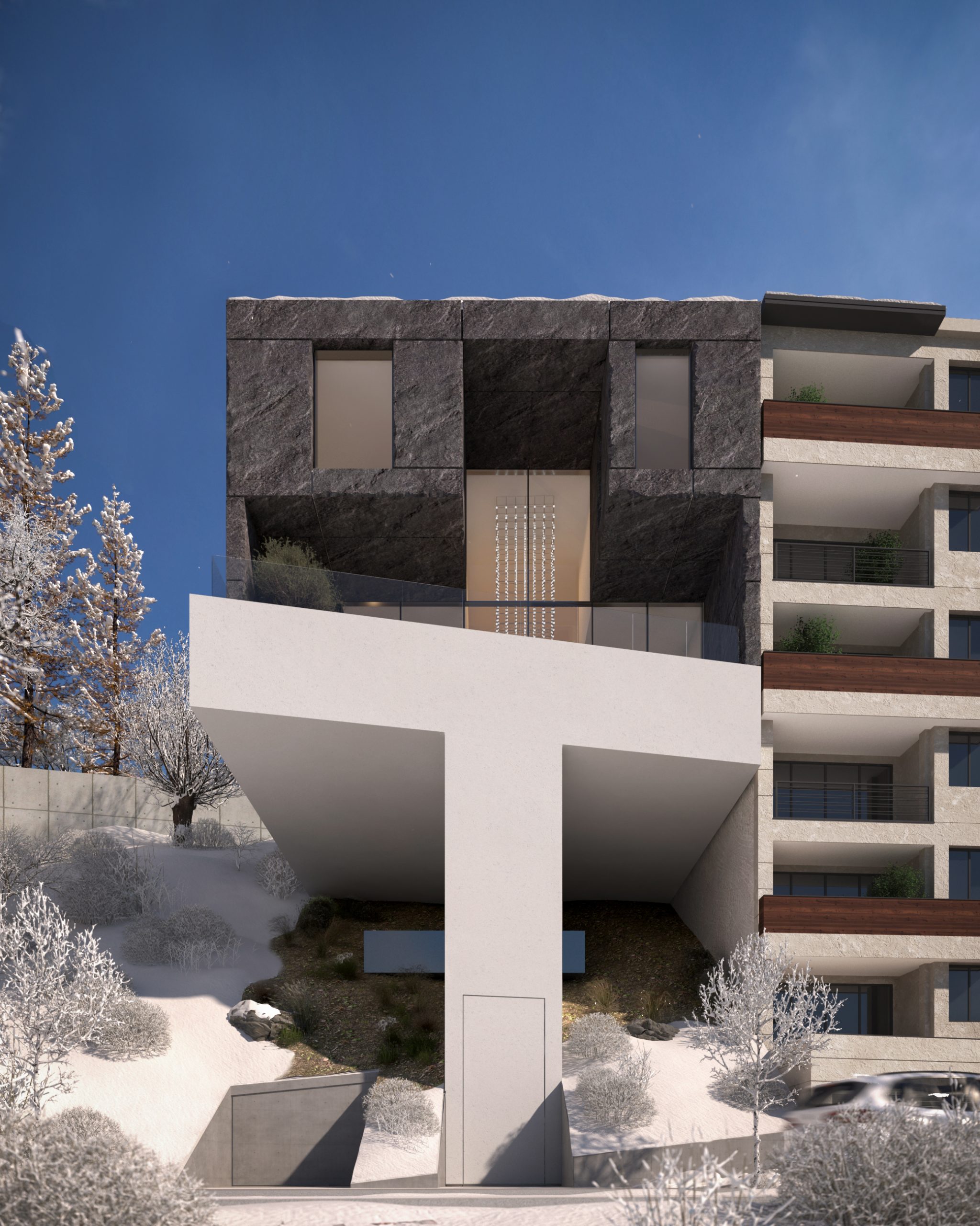 One of the project’s key challenges was the inconsistency of density between the villa and the surrounding urban fabric. The street is lined with six-story residential buildings that have fully exhausted their permitted building capacity. At the same time, in pursuit of spatial quality—maximizing natural light and framing the landscape—the option of embedding the villa into the slope was dismissed.